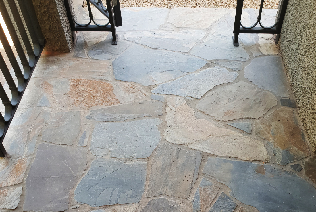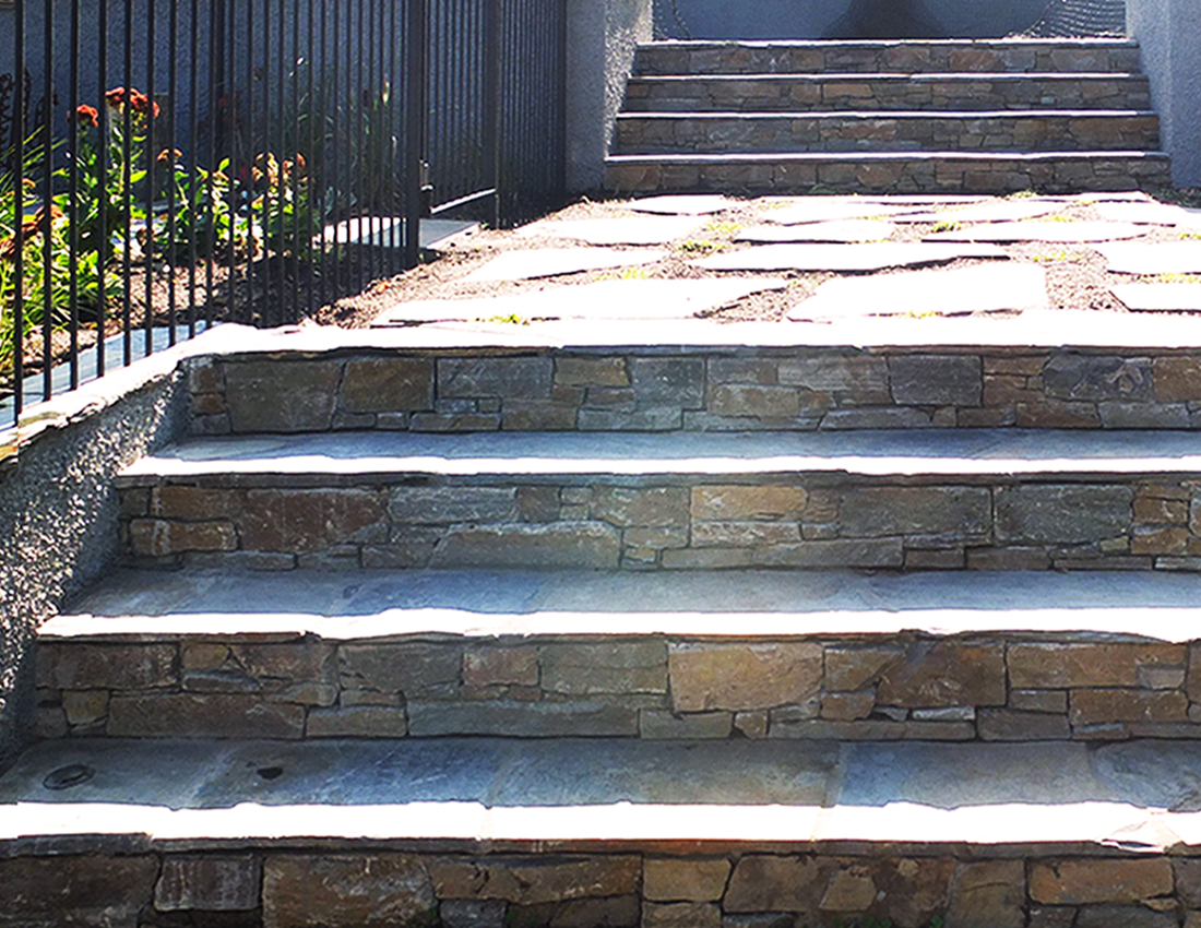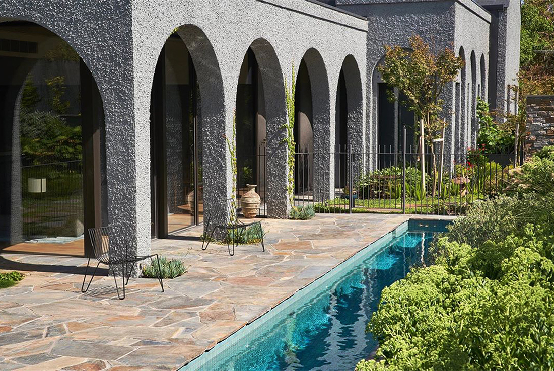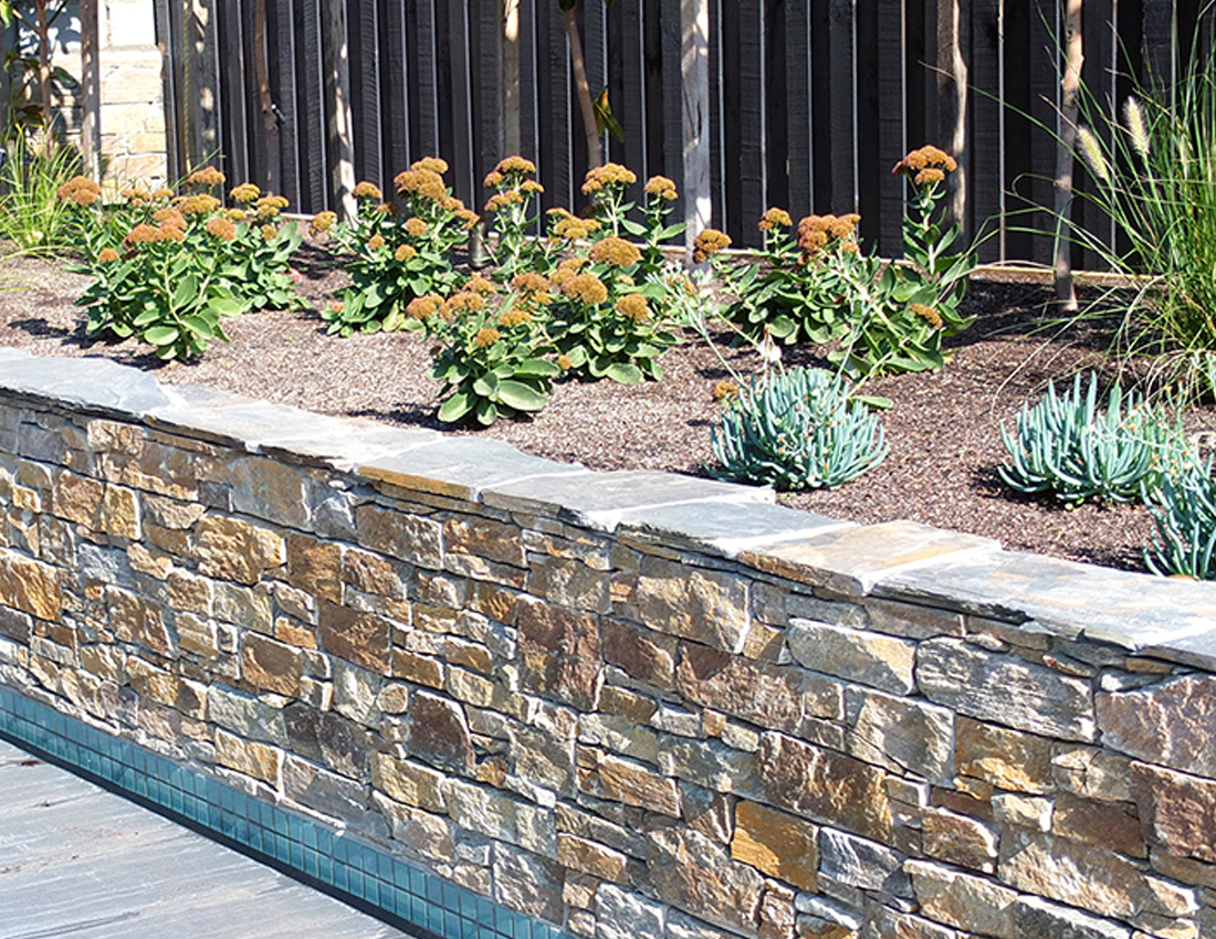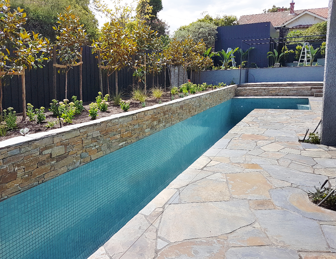 This was a complete landscape project for this new build on a large block – whole front, side and backyard. Castlemaine Slate crazy paving lead up to the entrance of the property, and winding through to the back surrounding the lap pool with its dramatic steel pool fence. Out the back, retaining walls carved into the land continuing the theme of the beautiful Castlemaine Slate crazy paving that lead to the upper level synthetic turf cricket pitch. The whole property was covered in over 1,600 plants and trees.
