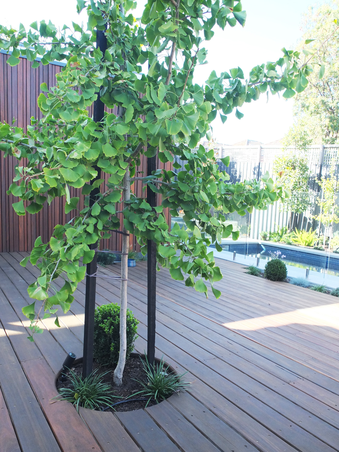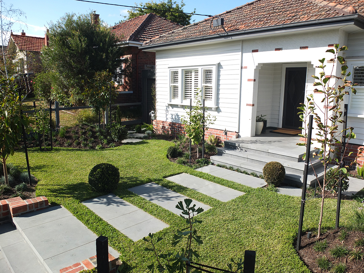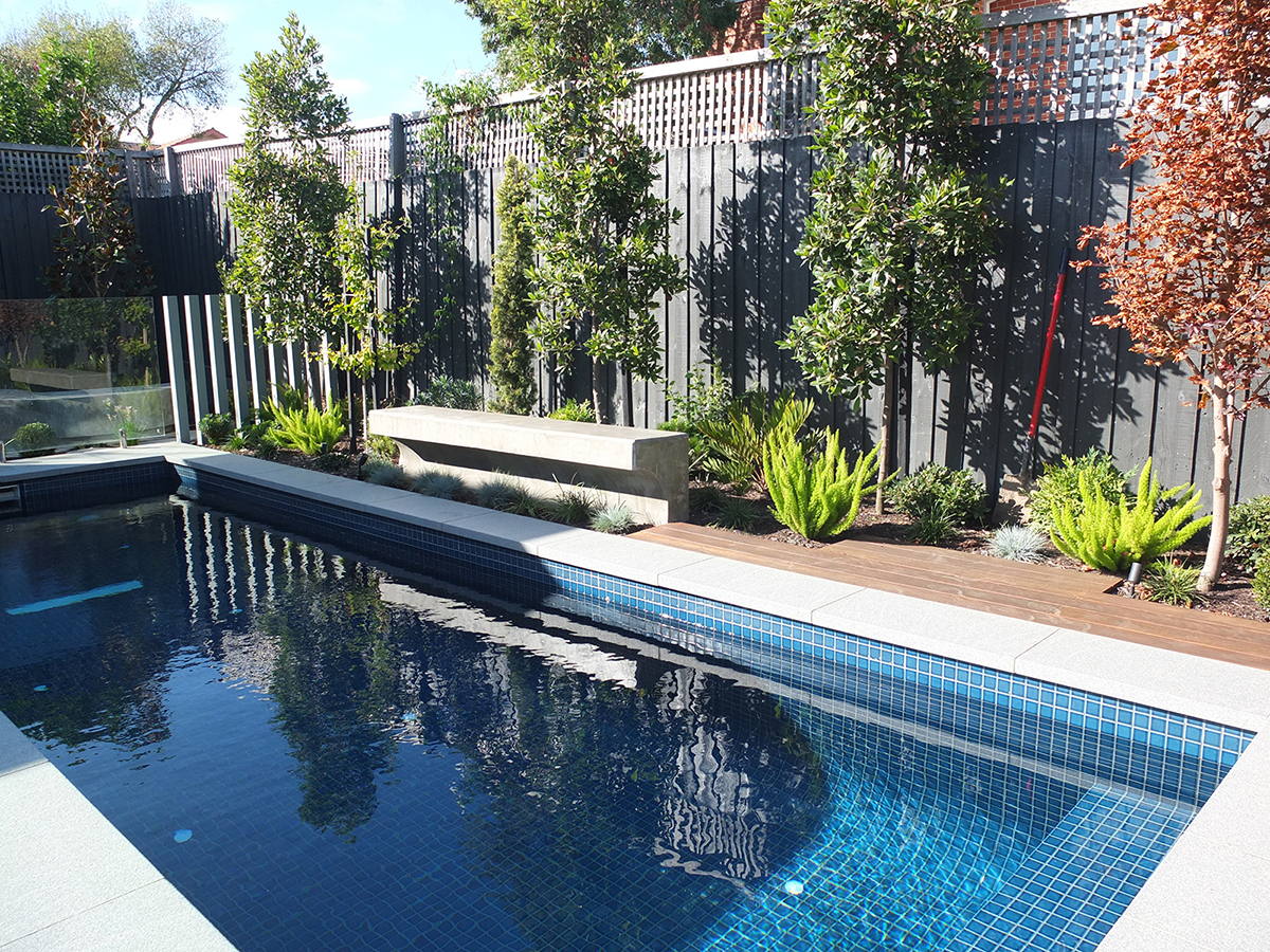 Working in conjunction with Rick Molino, a Landscape Designer, we brought Rick’s design to life by creating a luxury landscape experience. This was a total front, back and side project. We constructed the grand front entrance with Bluestone pavers, lush lawn area which is surrounded by a brick wall and a selection of complimentary trees and plants. Surrounding the pool out the back are custom made circular Bluestone steppers and a stand out concrete bench, all with a variety of ground covers, hand selected trees and plants to give a tranquil feel.